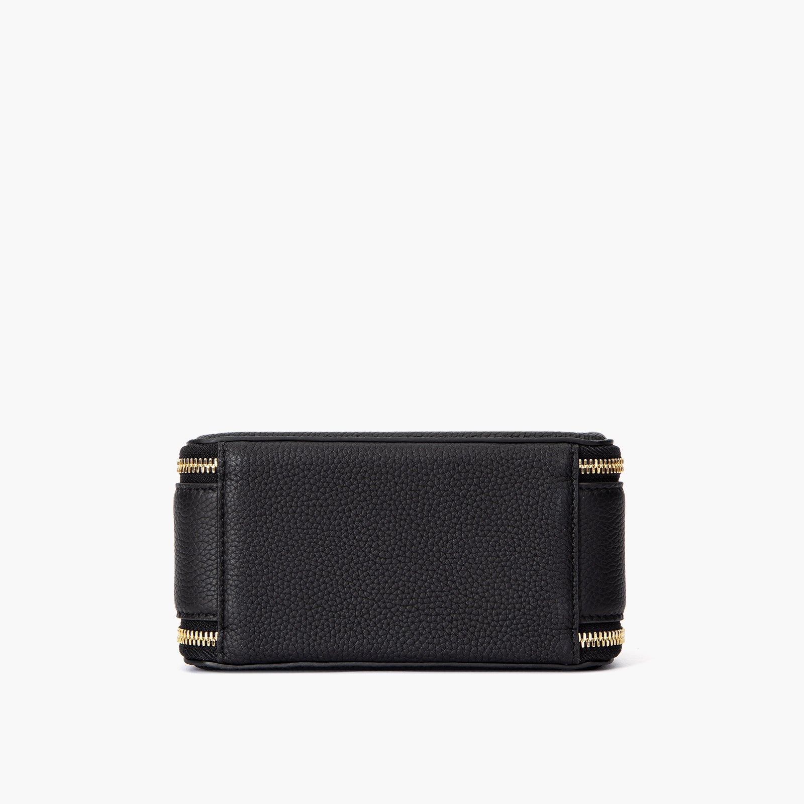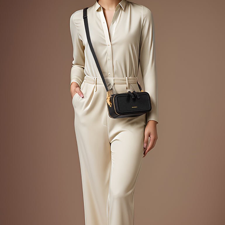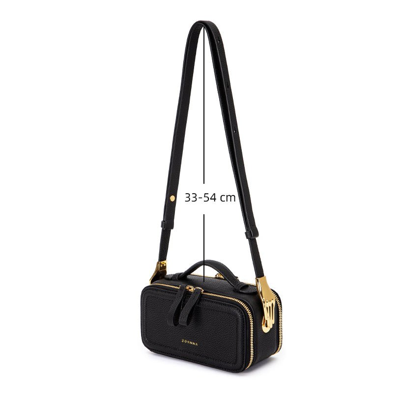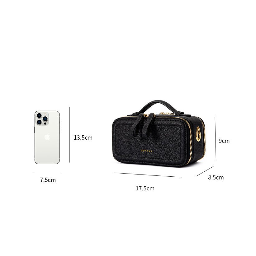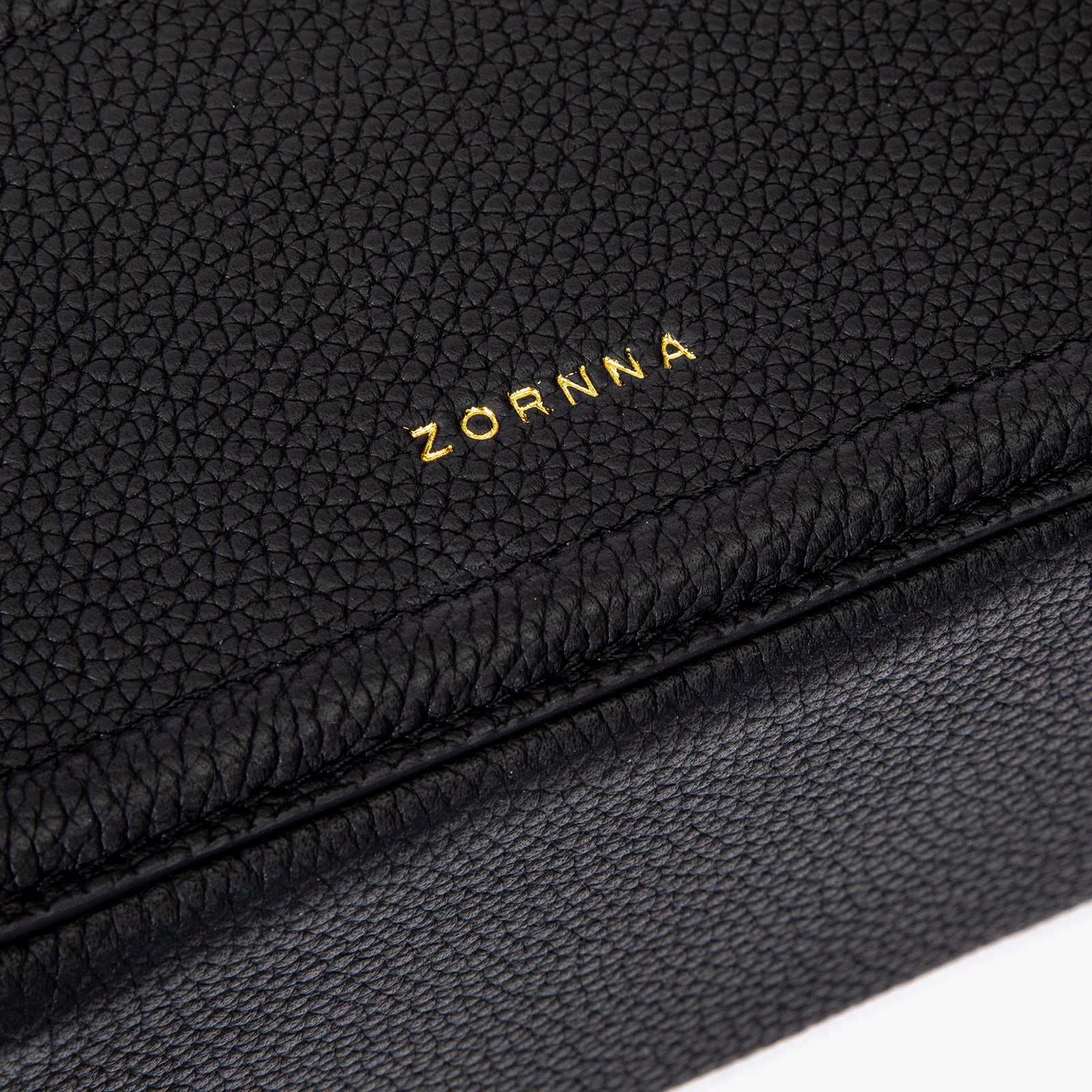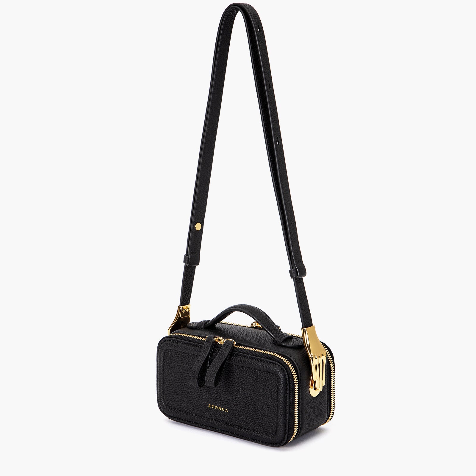 ChicCube Crossbody Bag in black pebbled leather, box-like appearance, double zippers on the front and back, ZORNNA logo printed on the front.