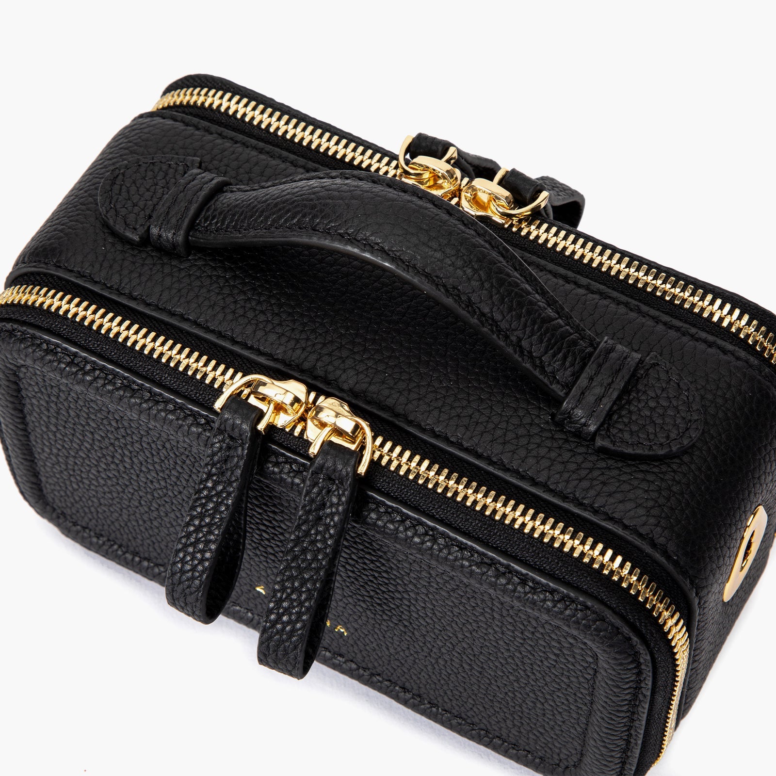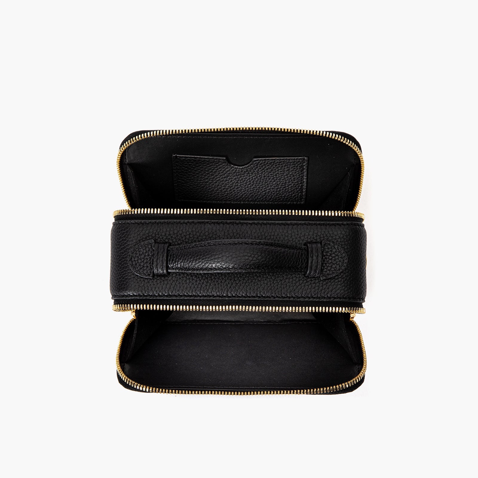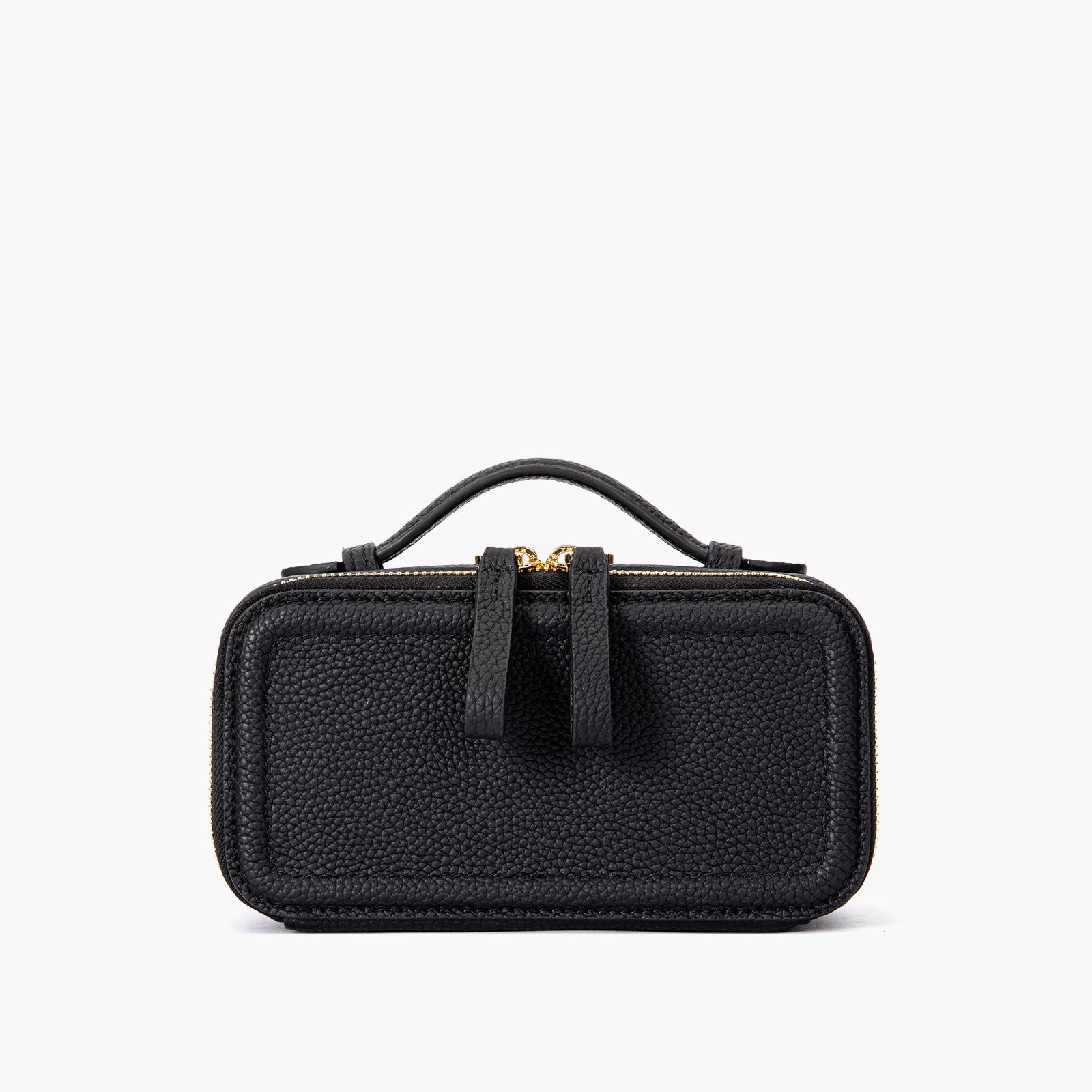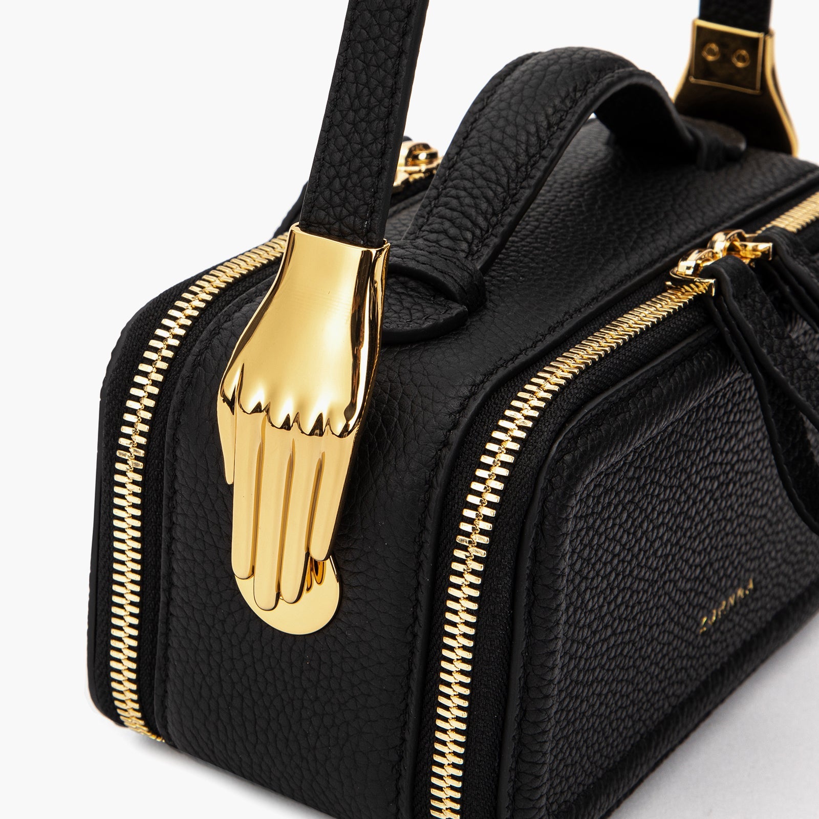 ChicCube Crossbody Bag in black pebbled leather, box-like appearance, double zippers on the front and back, ZORNNA logo printed on the front.
