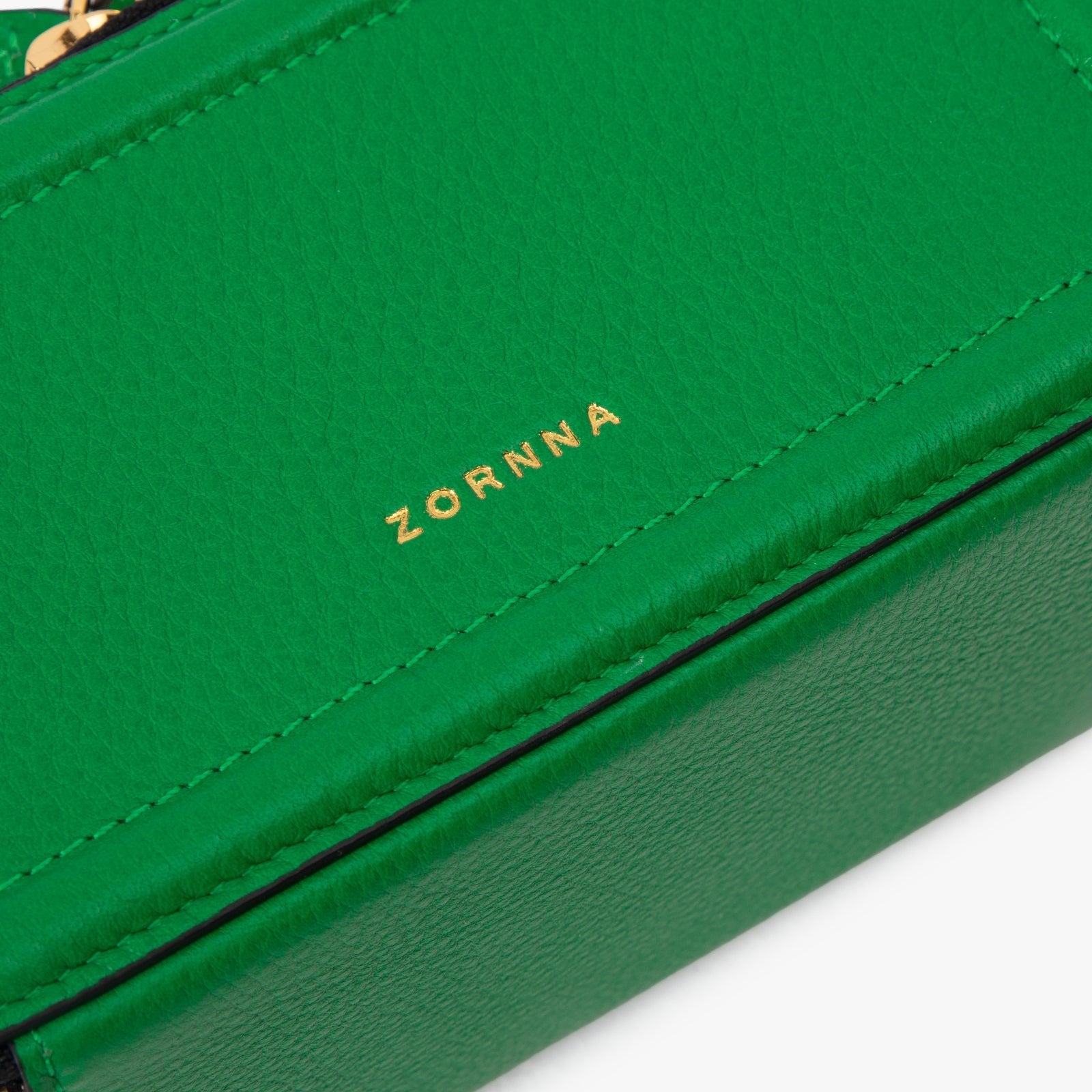 ChicCube Crossbody Bag in pebbled leather, box-like appearance, double zippers on the front and back, ZORNNA logo printed on the front.