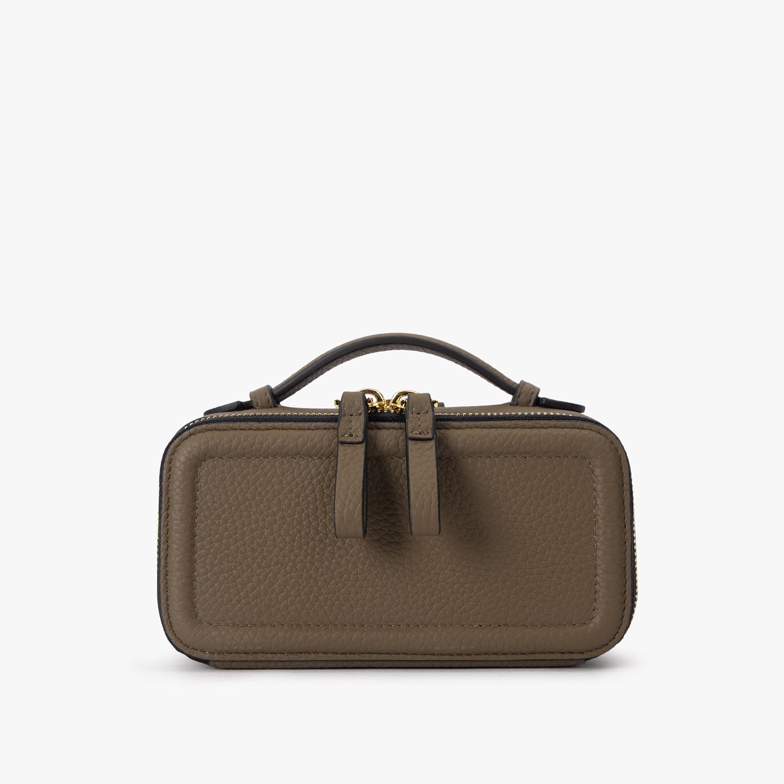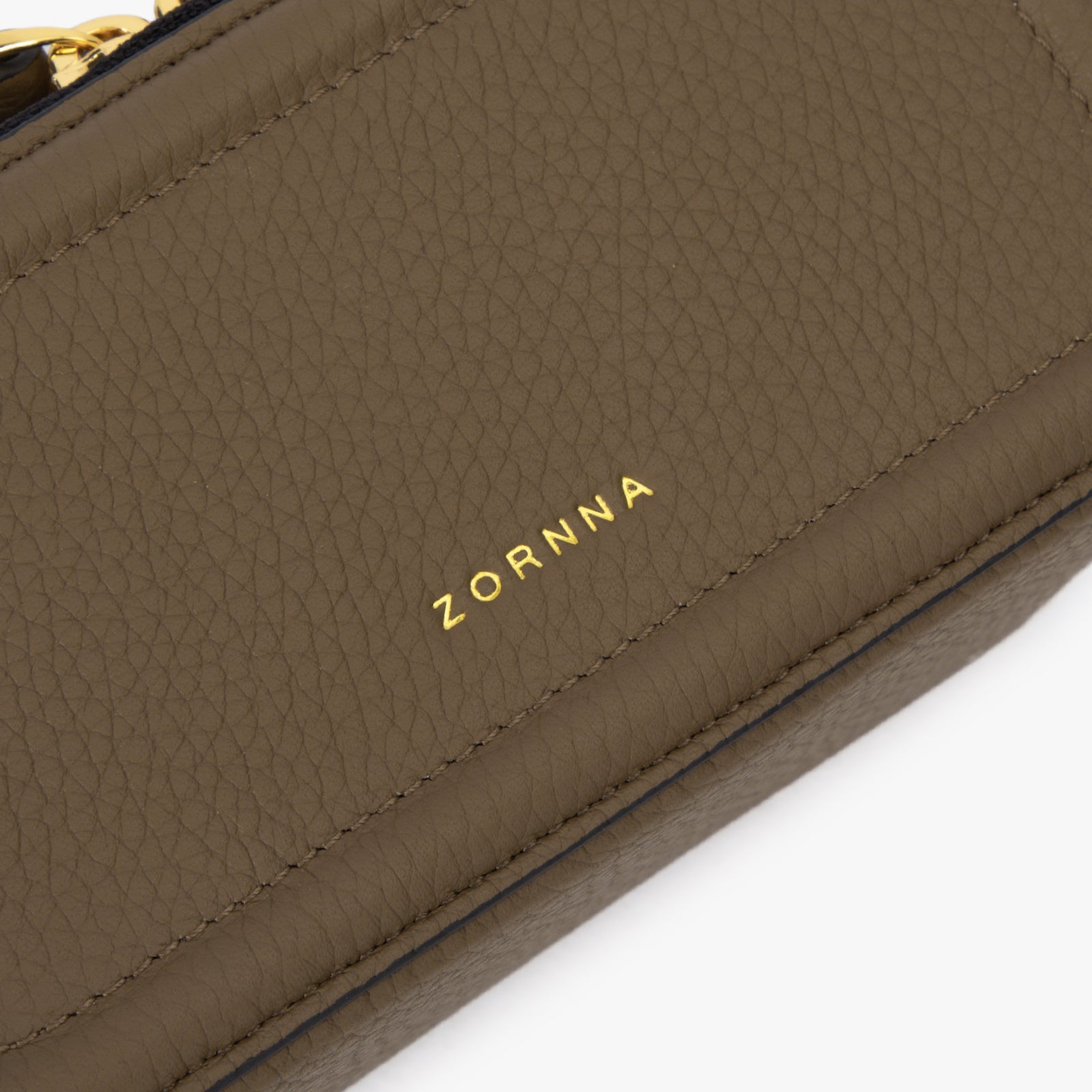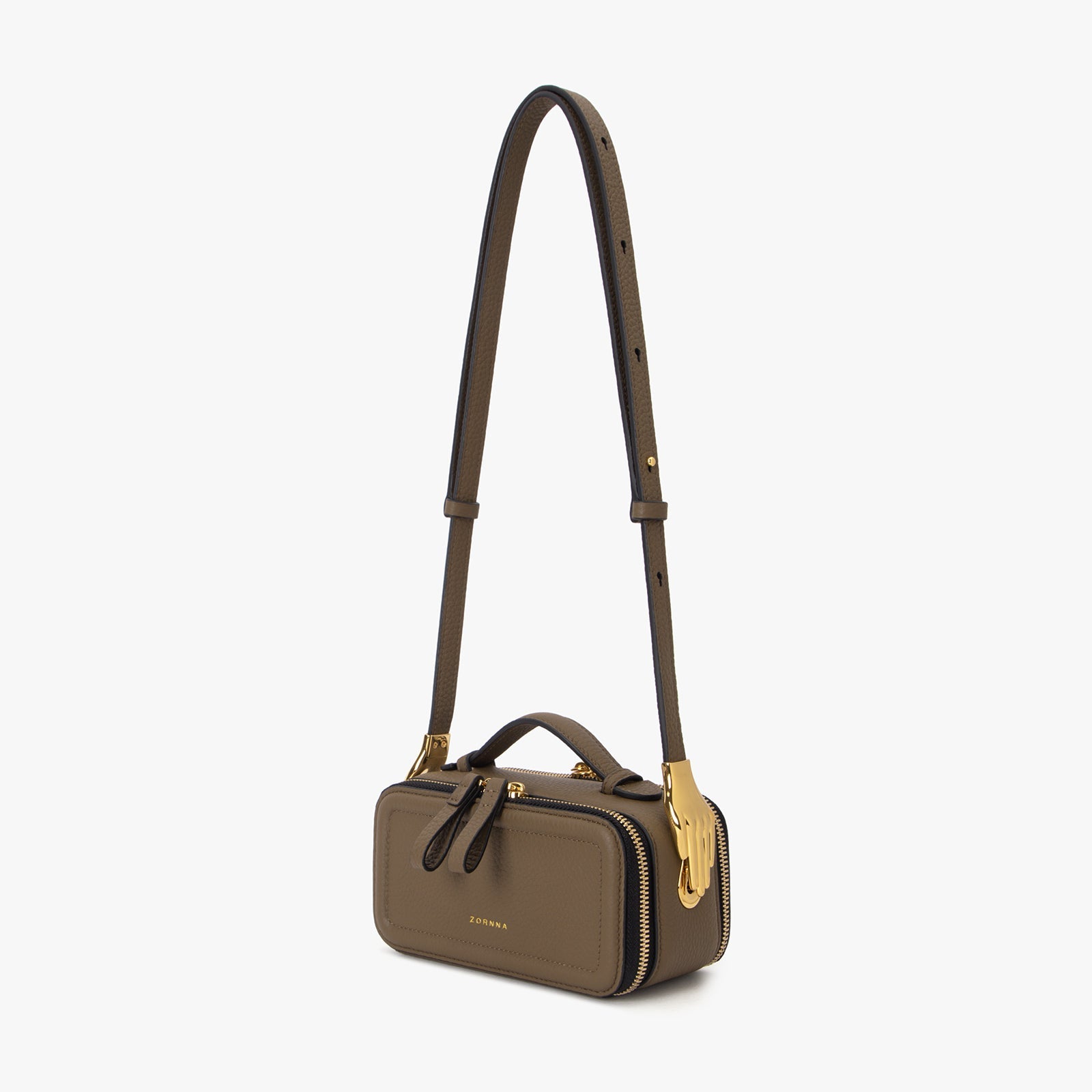 ChicCube Crossbody Bag in pebbled leather, box-like appearance, double zippers on the front and back, ZORNNA logo printed on the front.