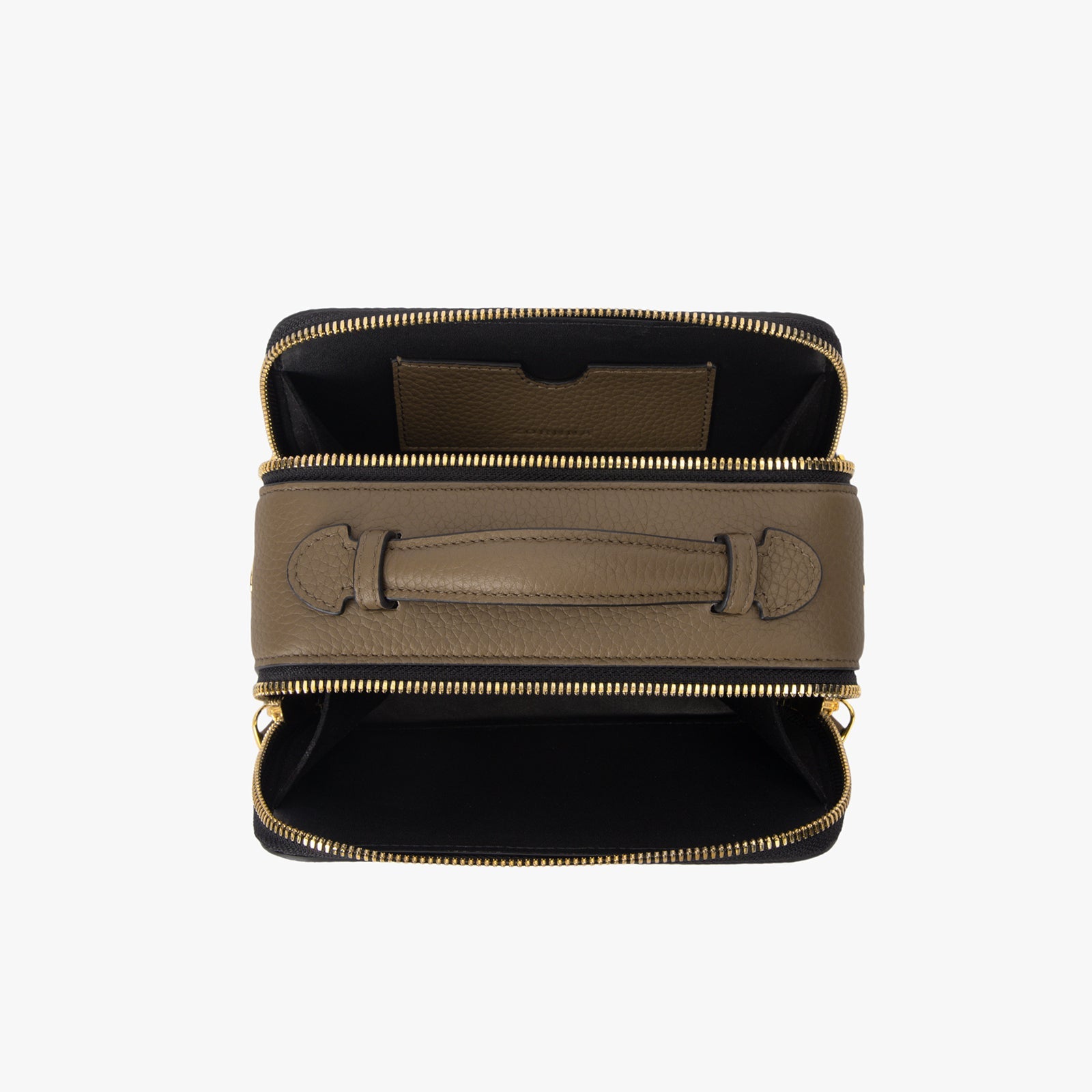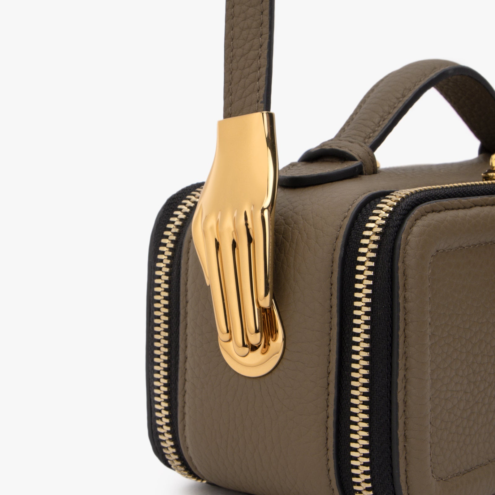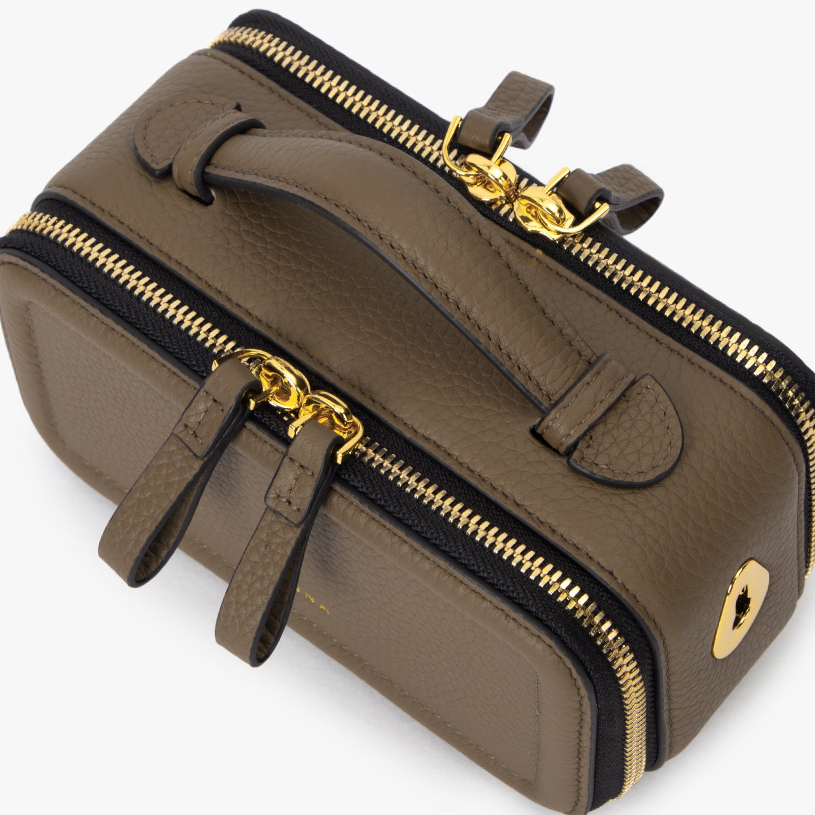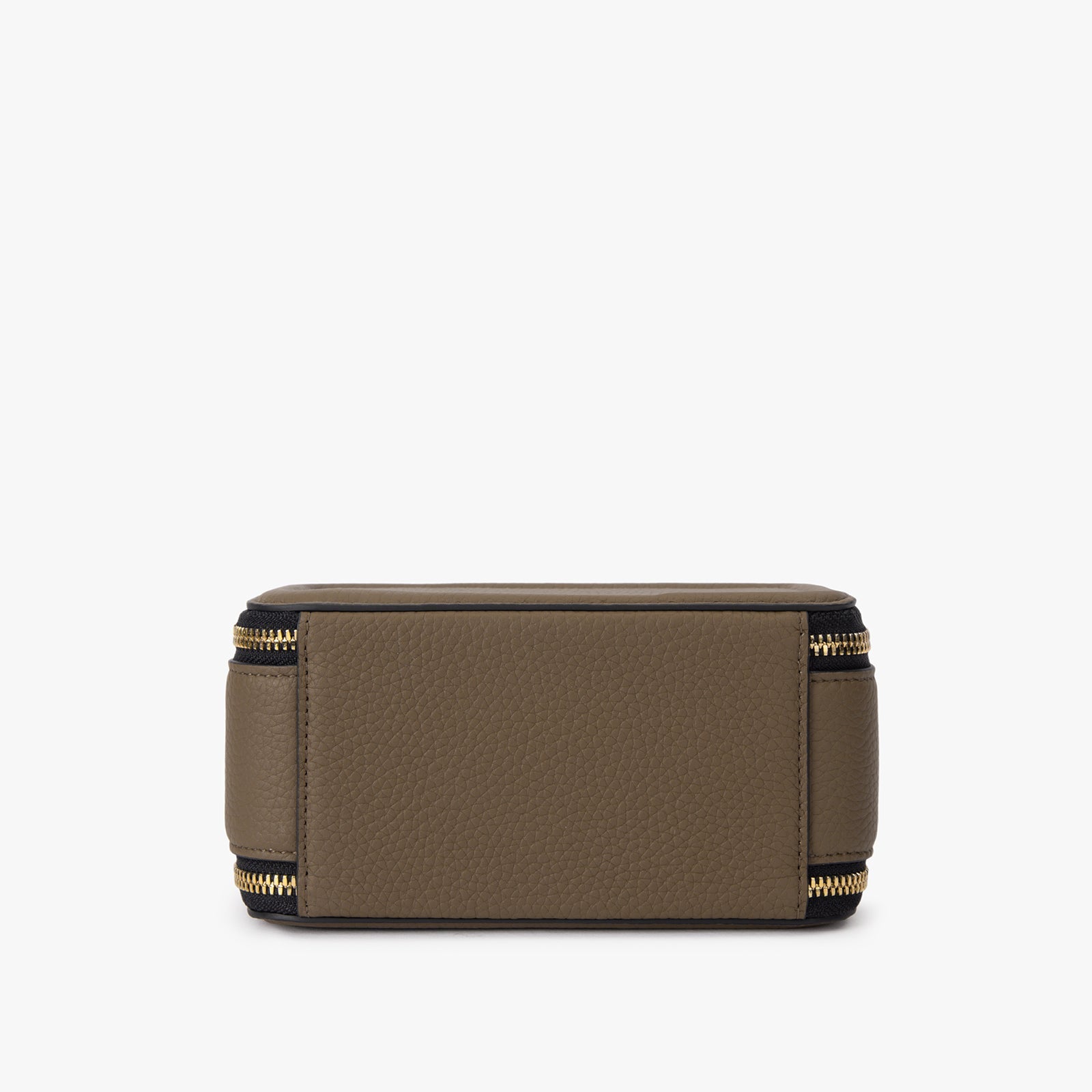 ChicCube Crossbody Bag in pebbled leather, box-like appearance, double zippers on the front and back, ZORNNA logo printed on the front.