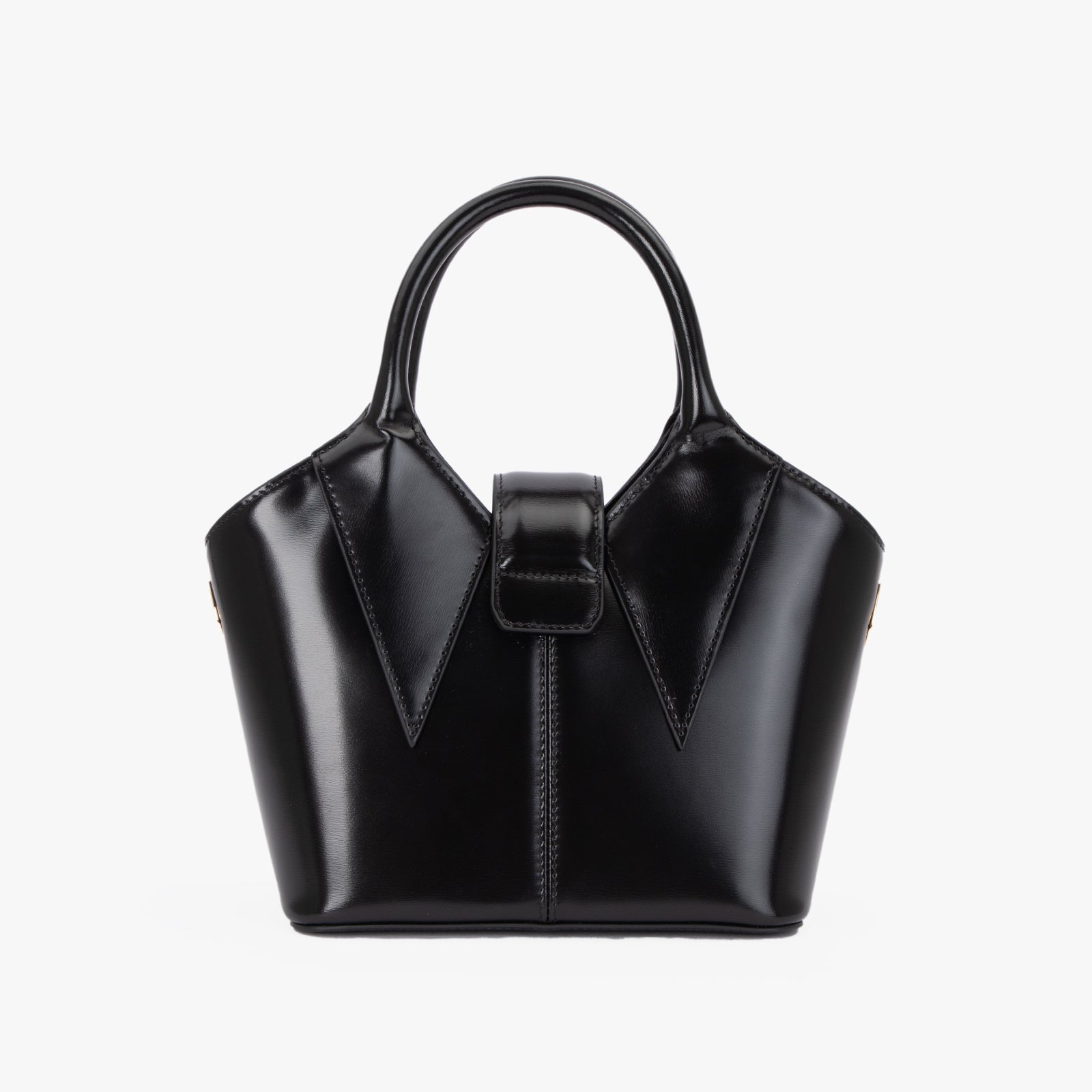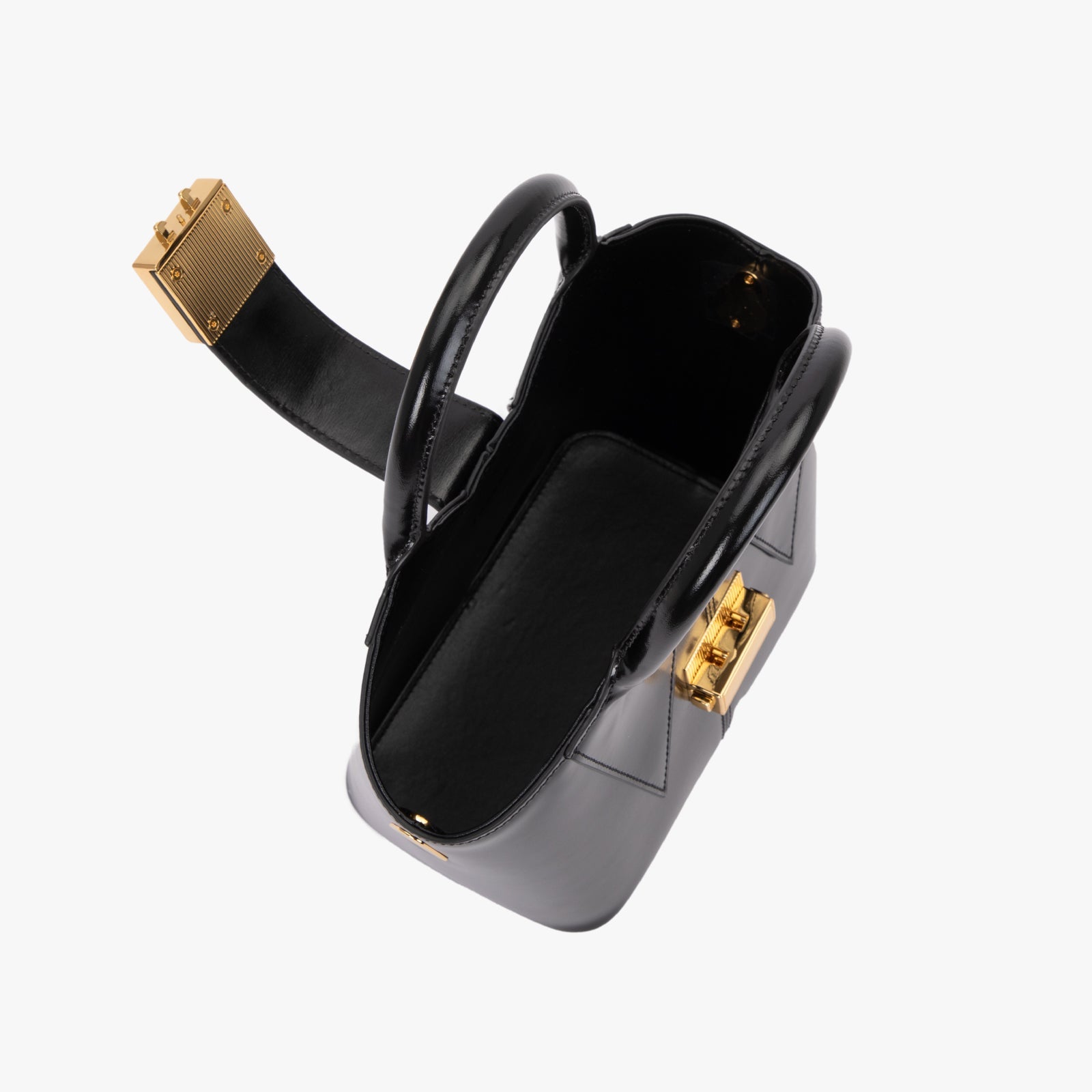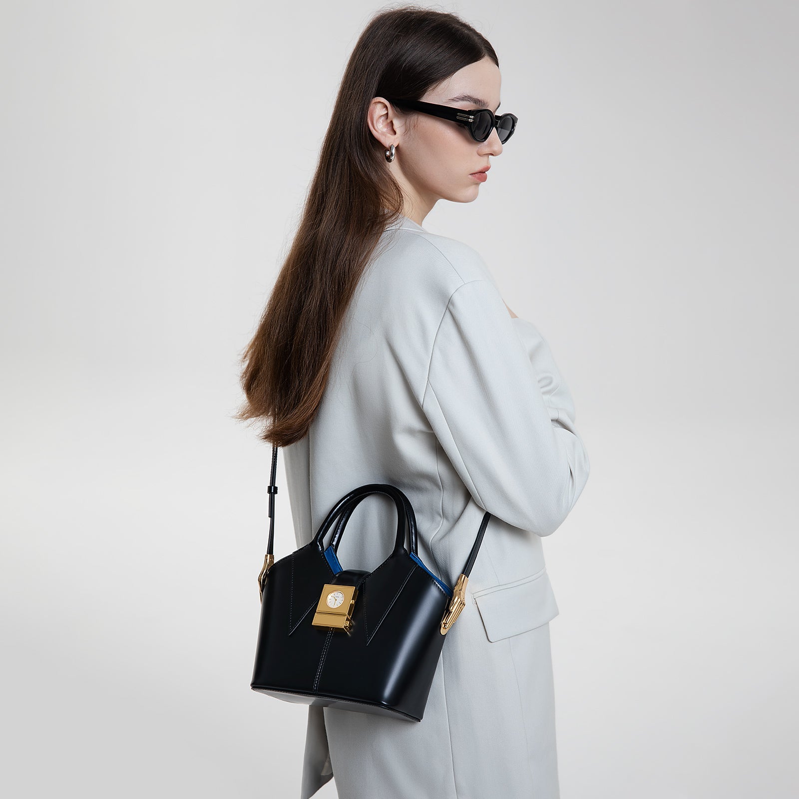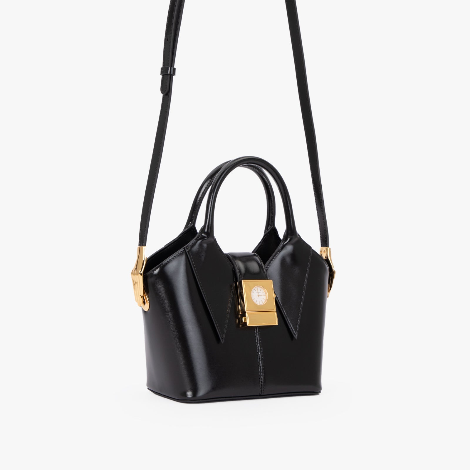 Coat Tote Large Top Handle Bag, made from black leather, adorned with a golden clock-shaped clasp on the front, and offering a spacious interior.