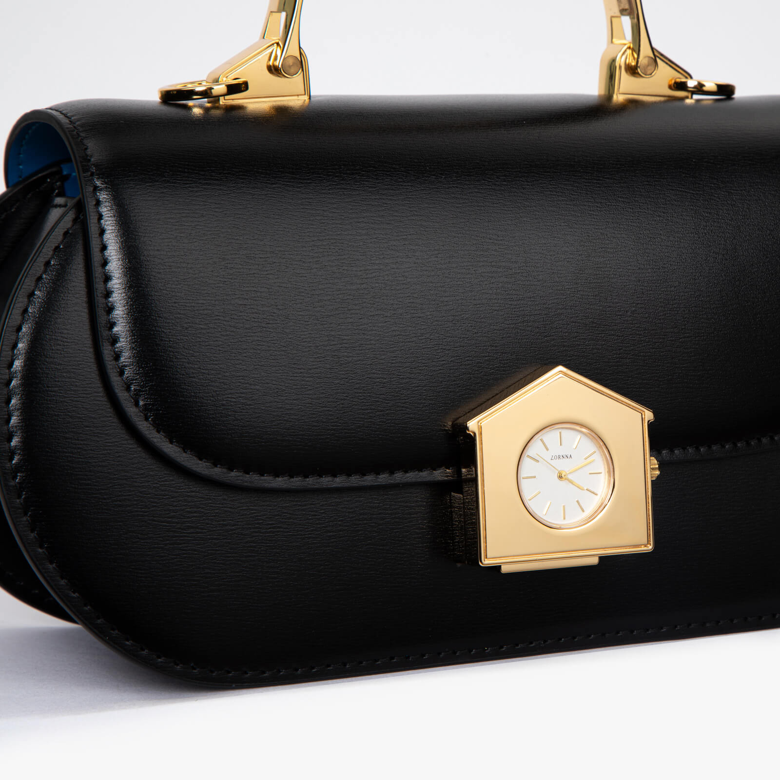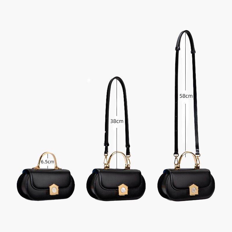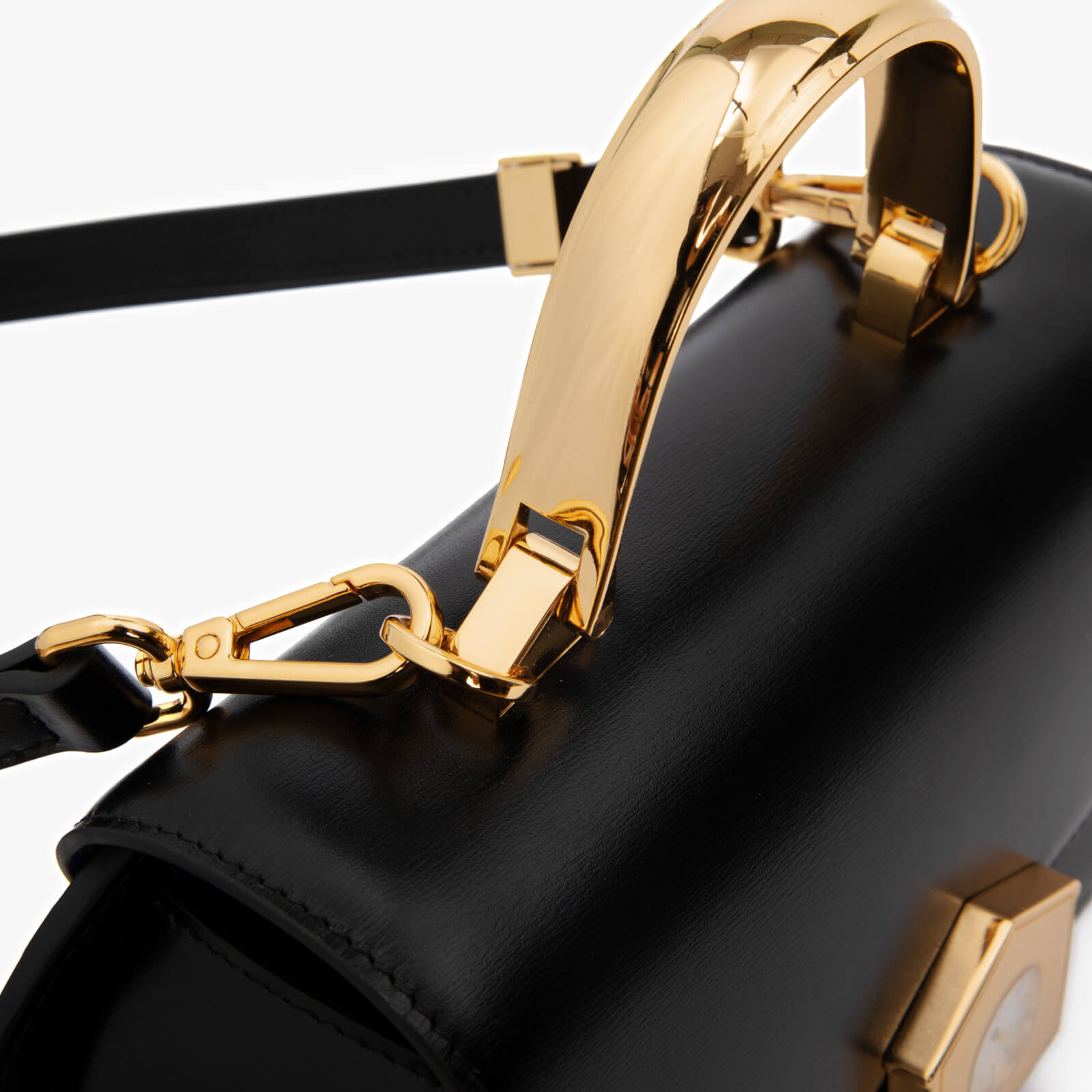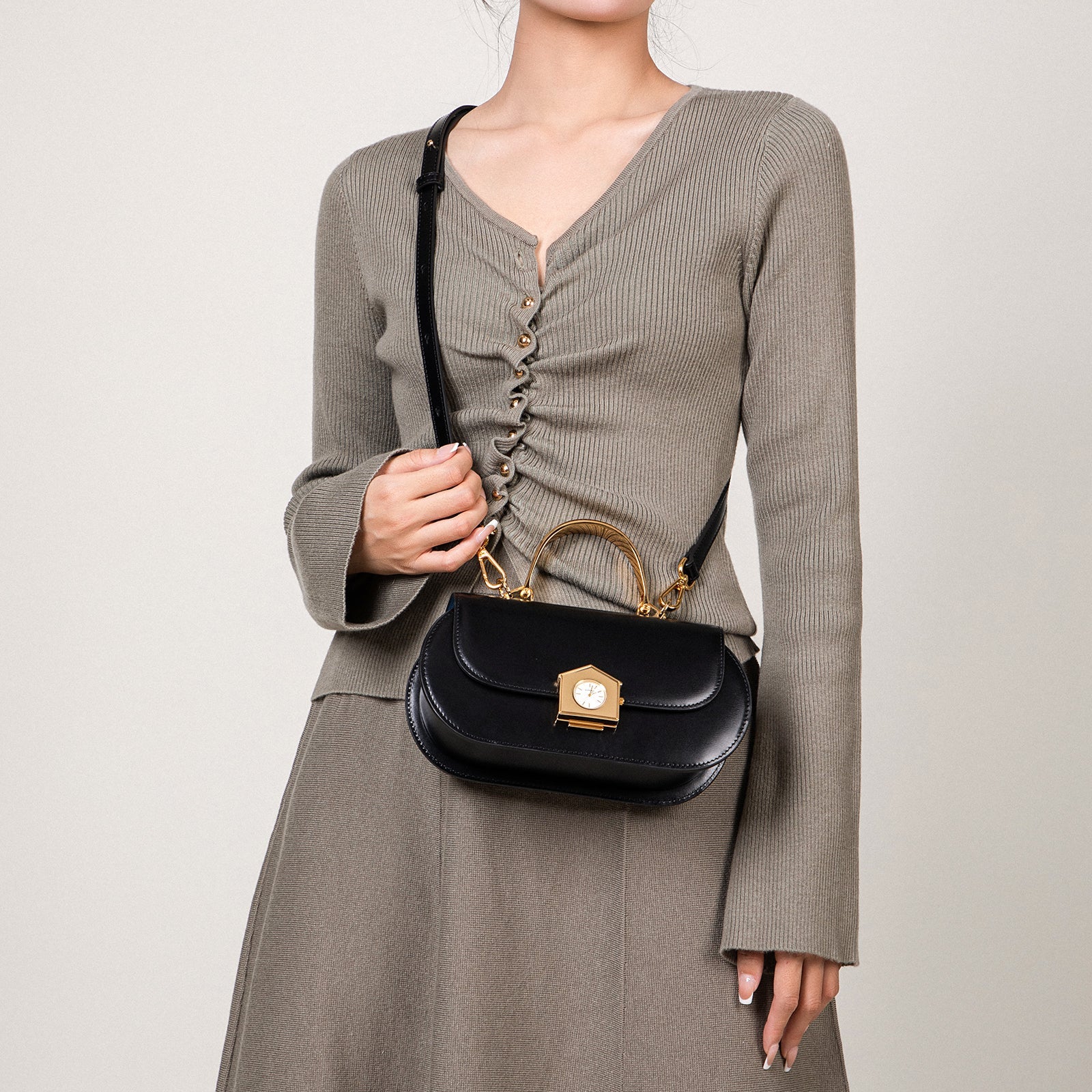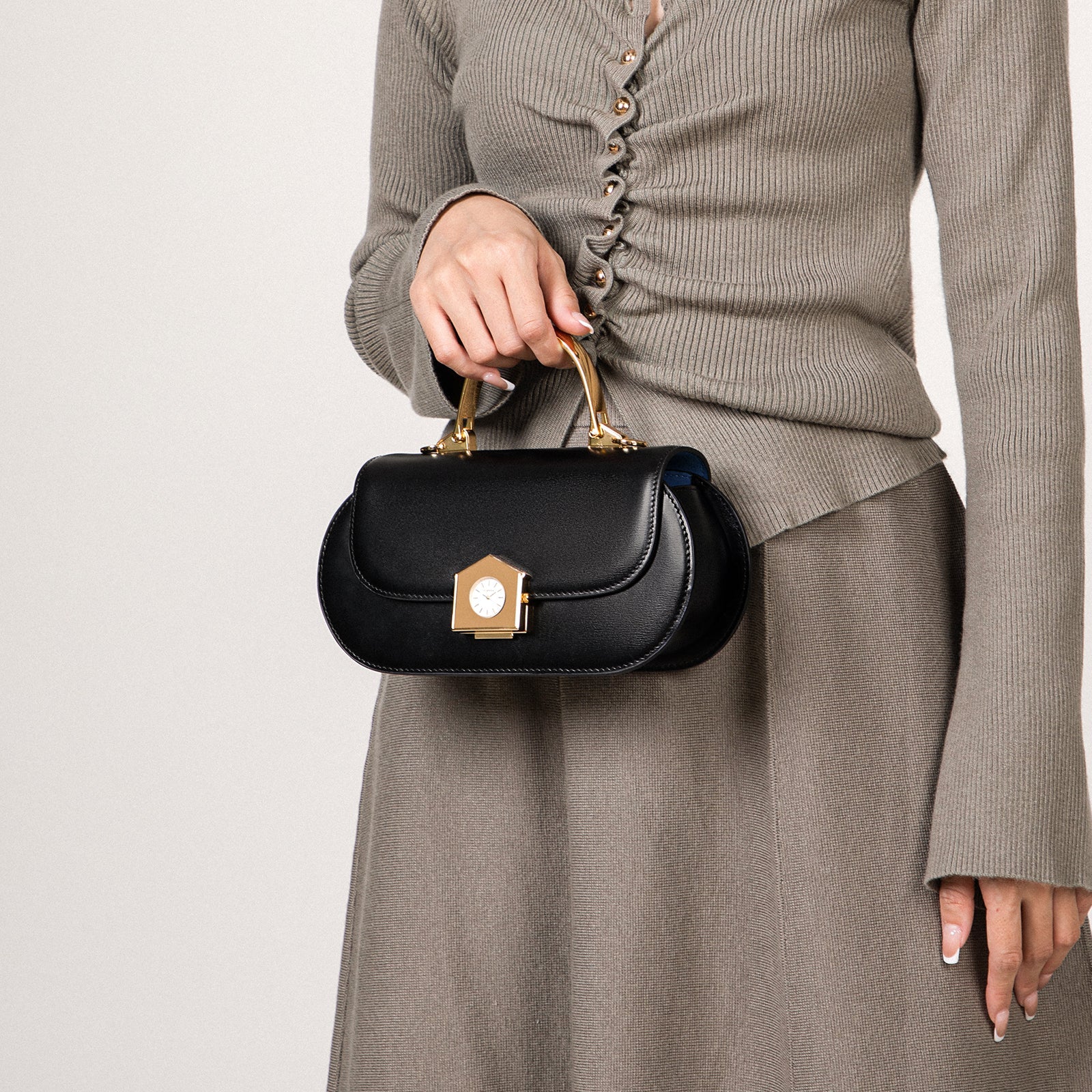 Sophia Top Handle Bag, designed in a box shape, with a flap closure and a gold-colored handle on top.