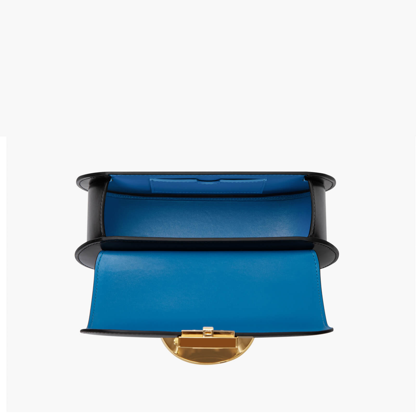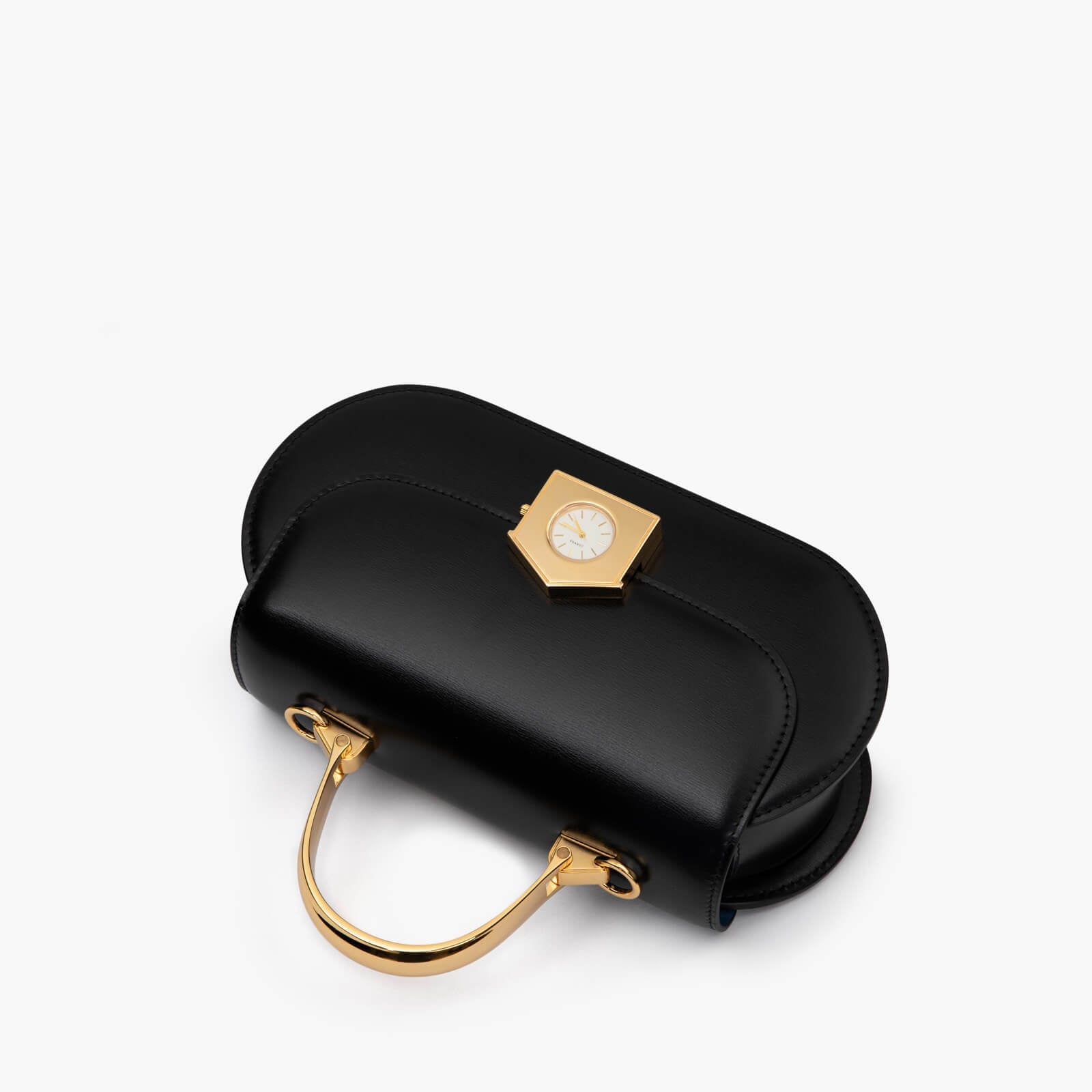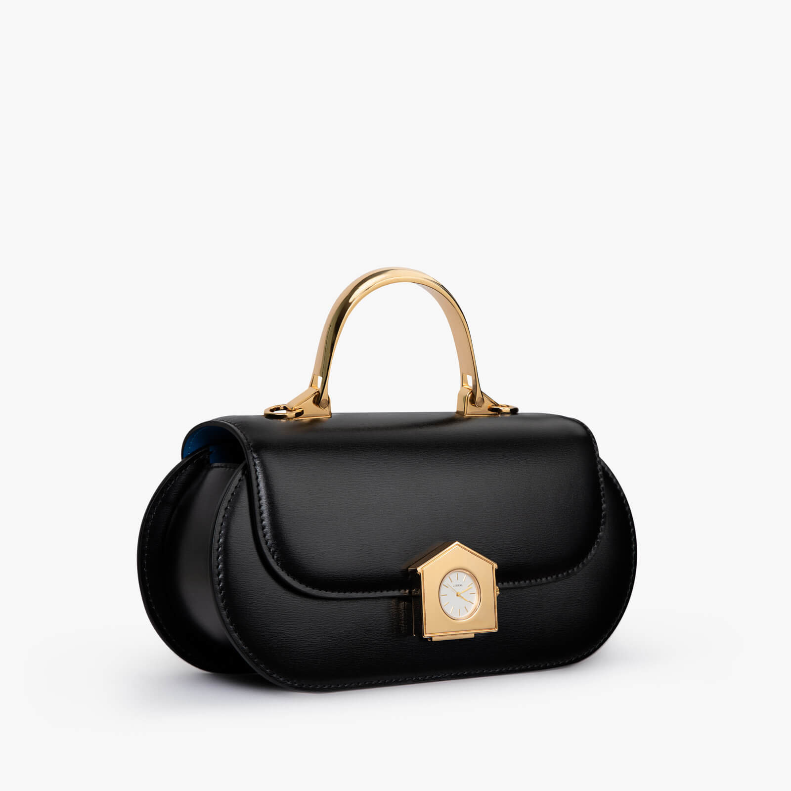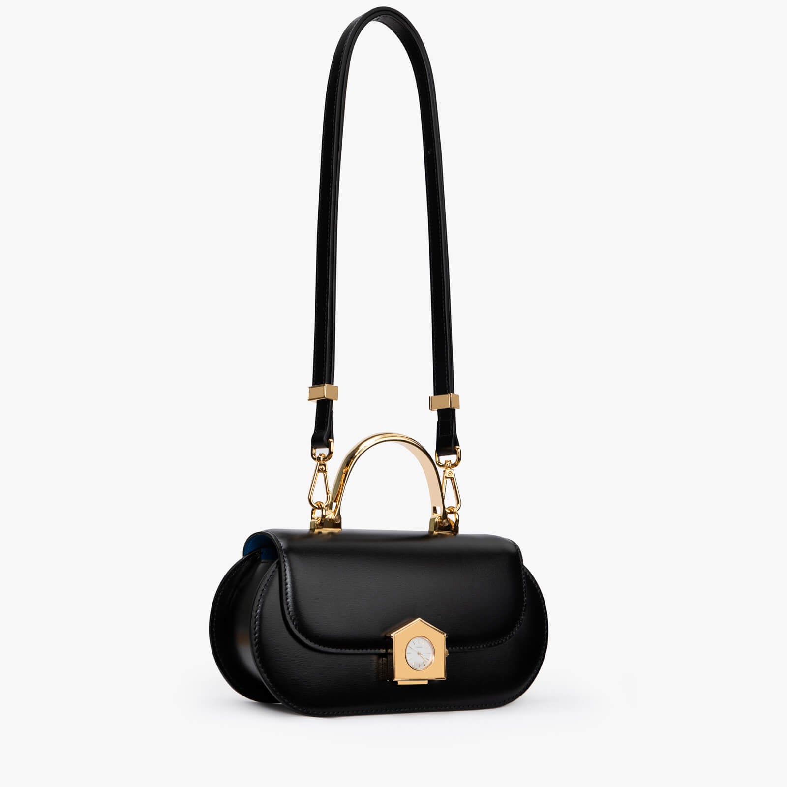 Sophia Top Handle Bag, designed in a box shape, with a flap closure and a gold-colored handle on top.