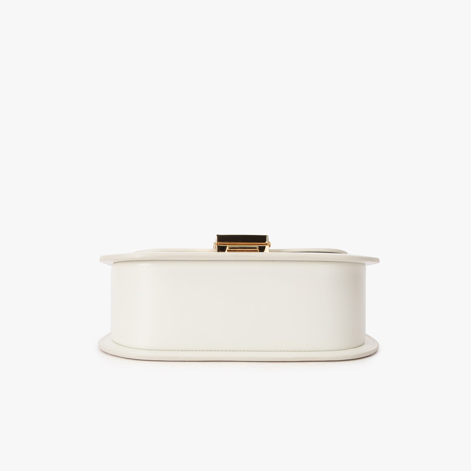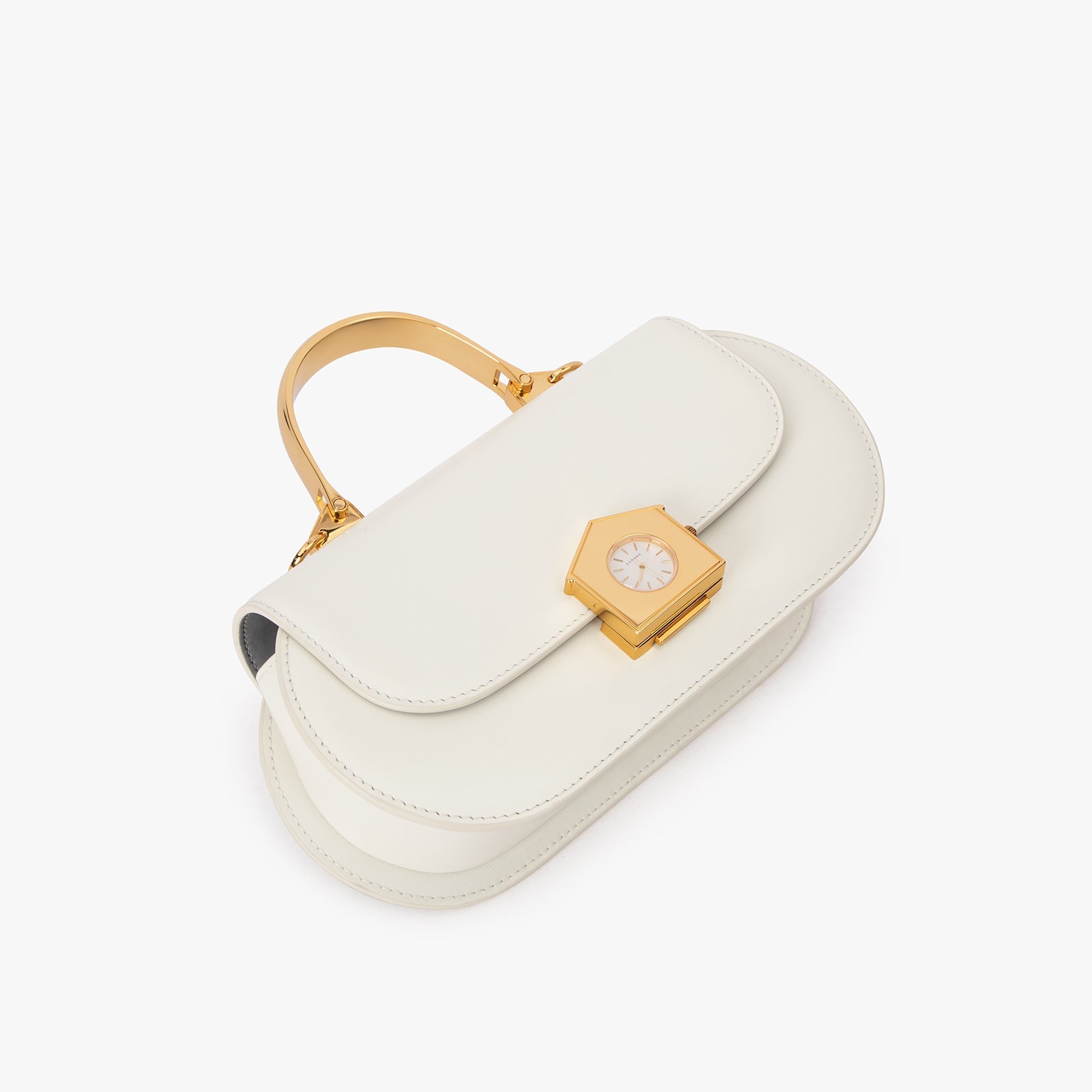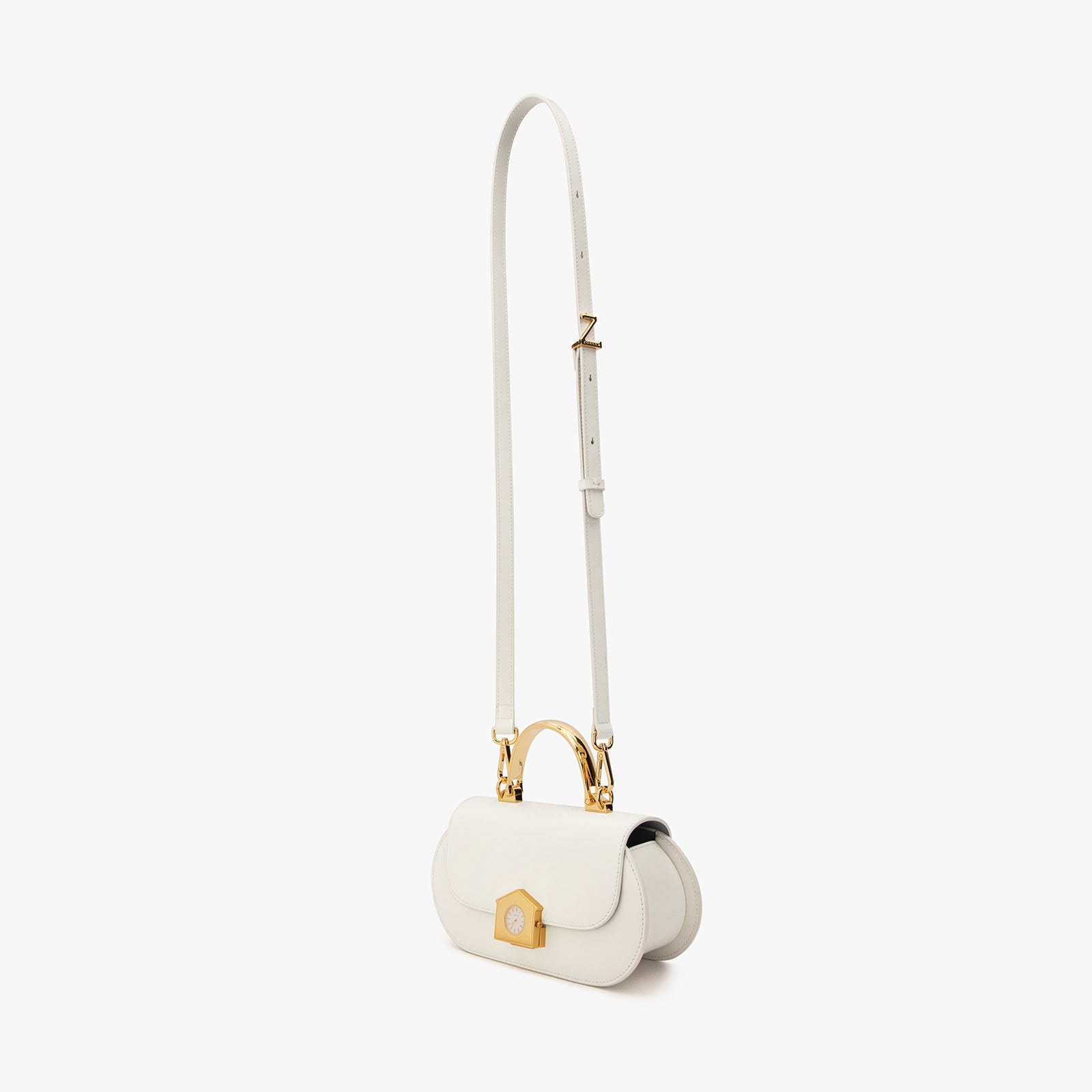 Sophia Top Handle Bag, designed in a box shape, with a flap closure and a gold-colored handle on top.