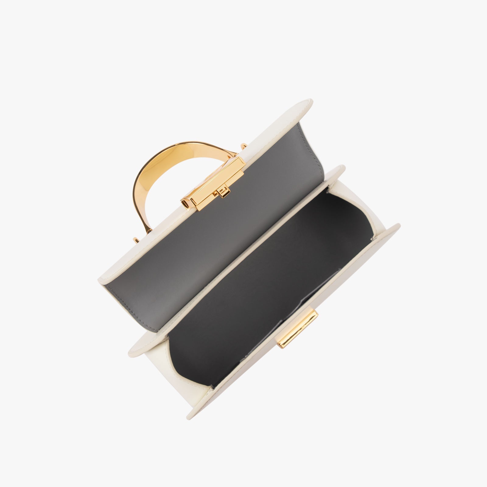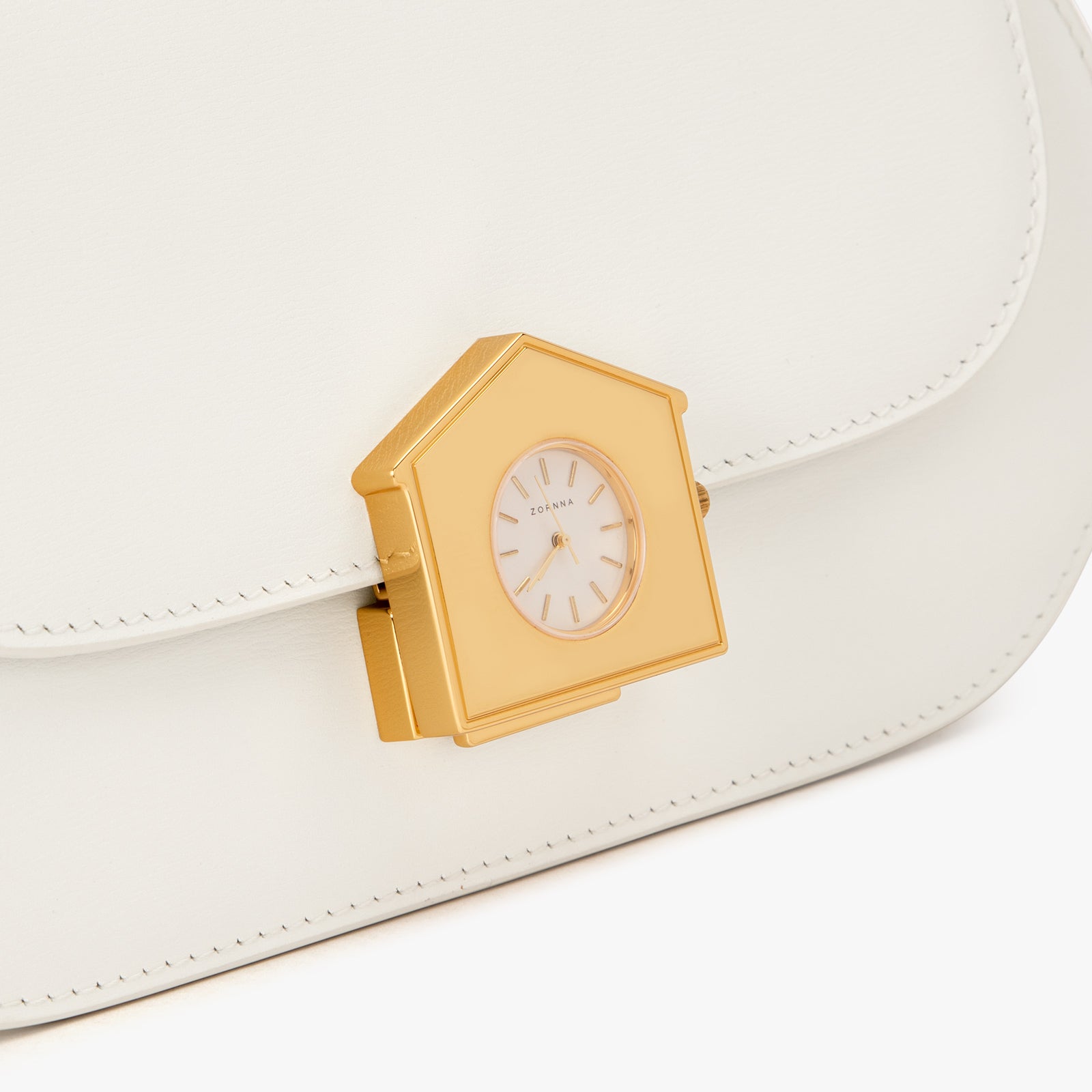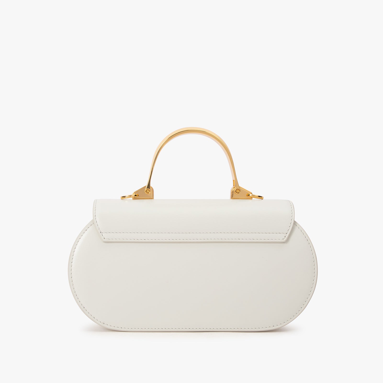 Sophia Top Handle Bag, designed in a box shape, with a flap closure and a gold-colored handle on top.