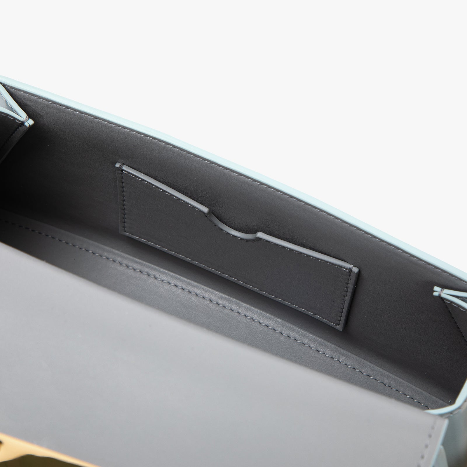 Olivia Baguette Bag with an adjustable long shoulder strap, a flap closure, and a clock-shaped lock fastener.