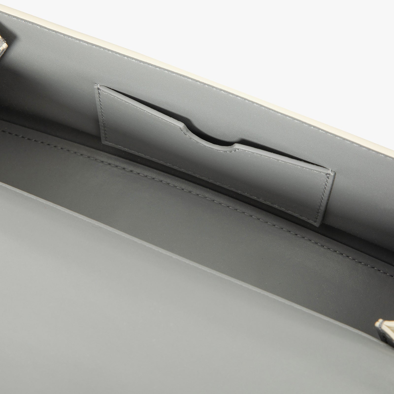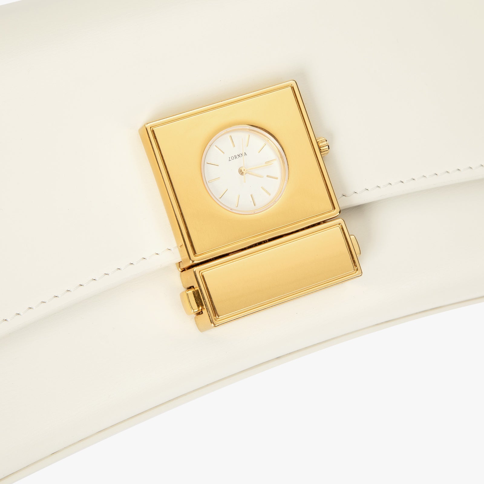Olivia Baguette Bag with an adjustable long shoulder strap, a flap closure, and a clock-shaped lock fastener.