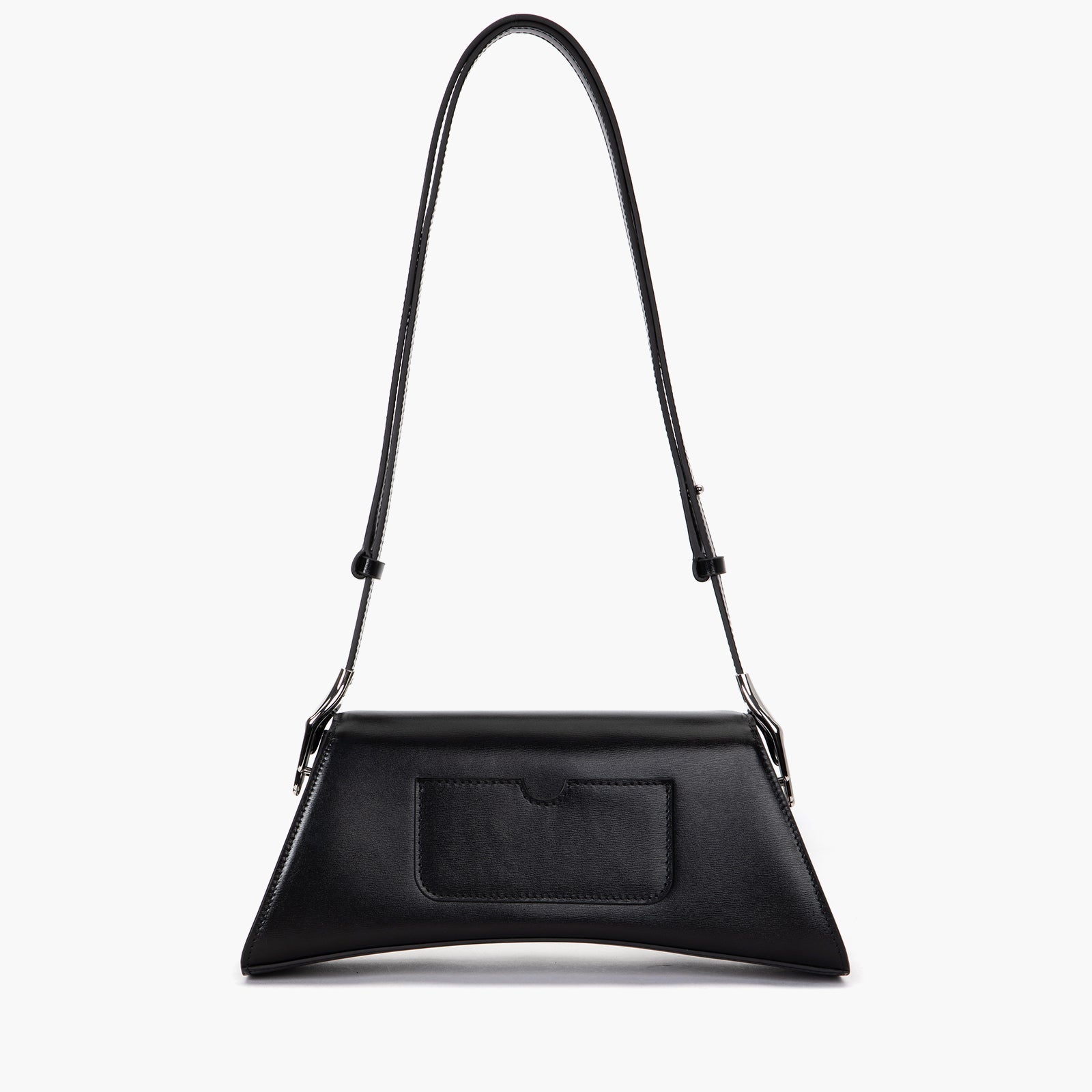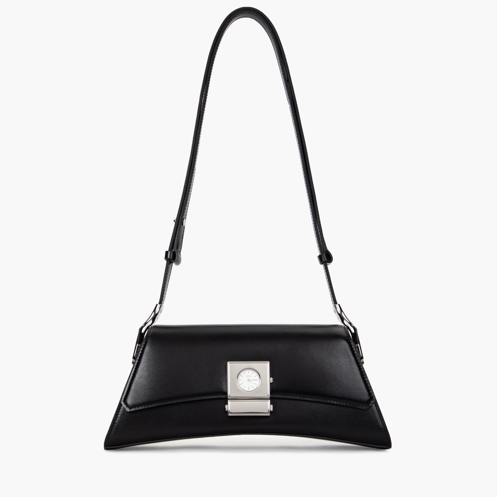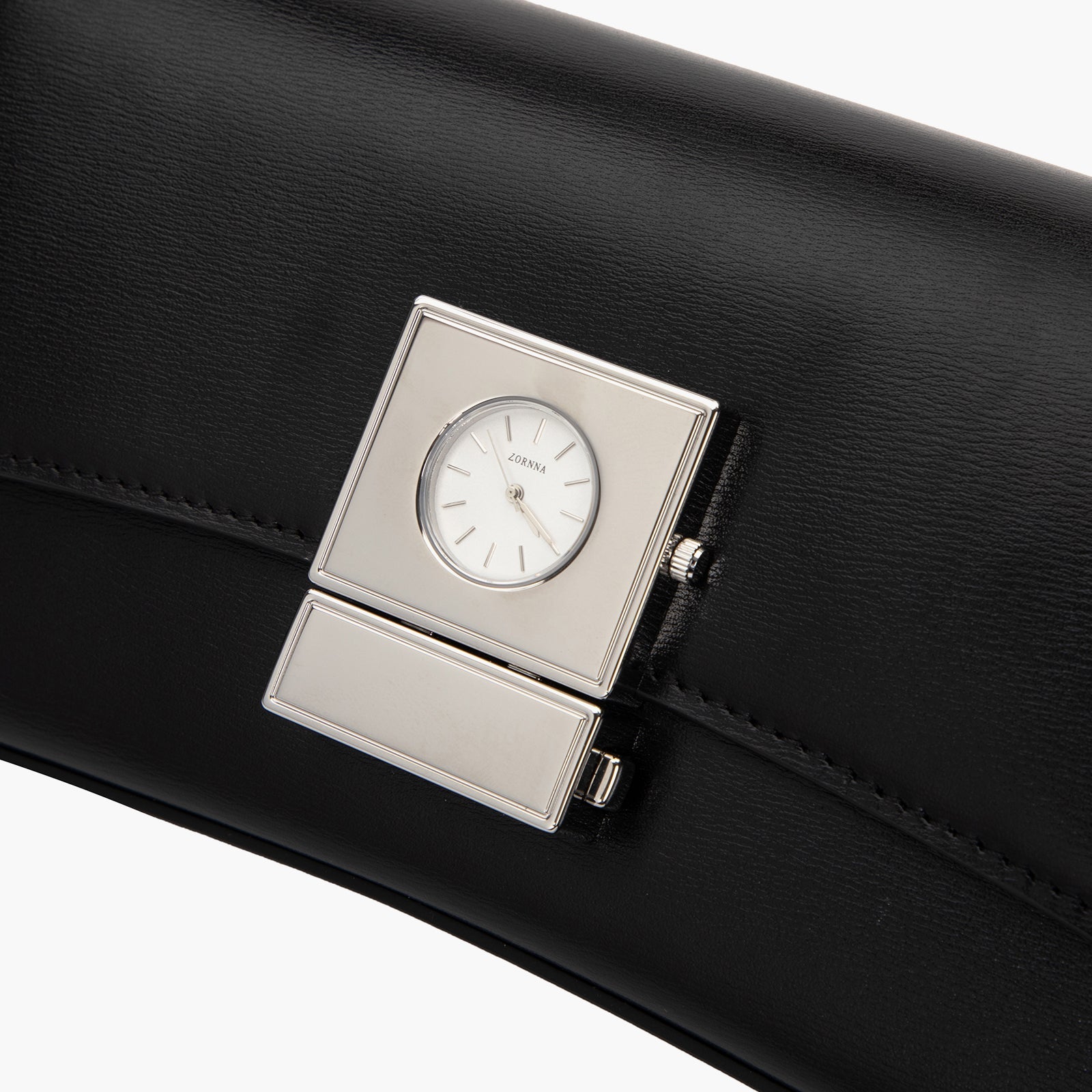 Custom silver from Noura-Noura Baguette Bag with an adjustable long shoulder strap, a flap closure, and a clock-shaped lock fastener.