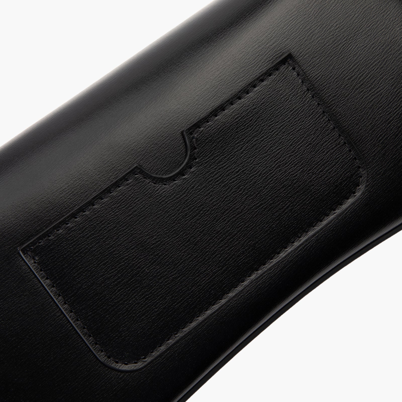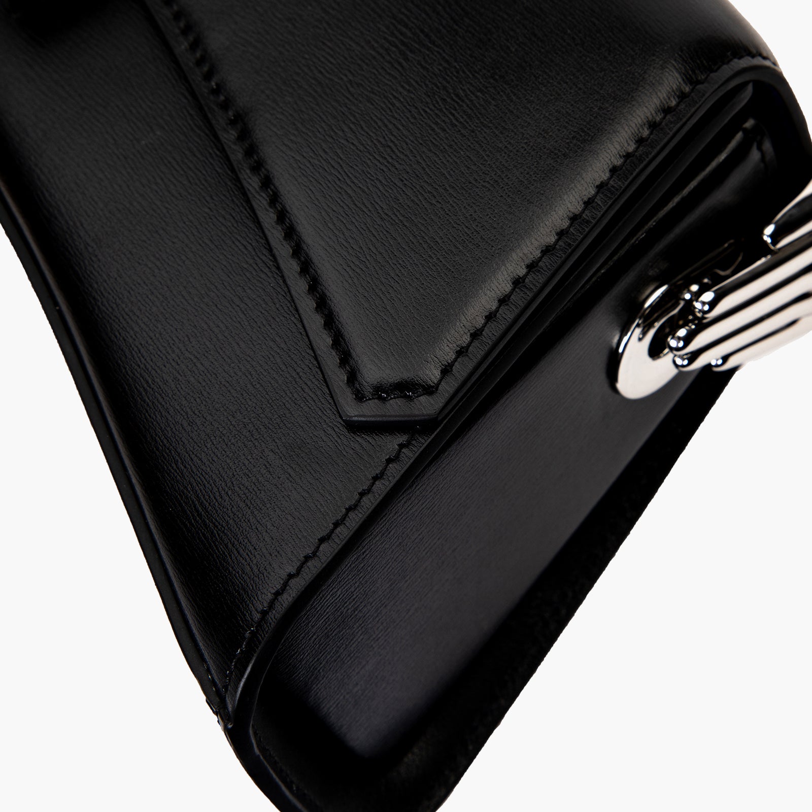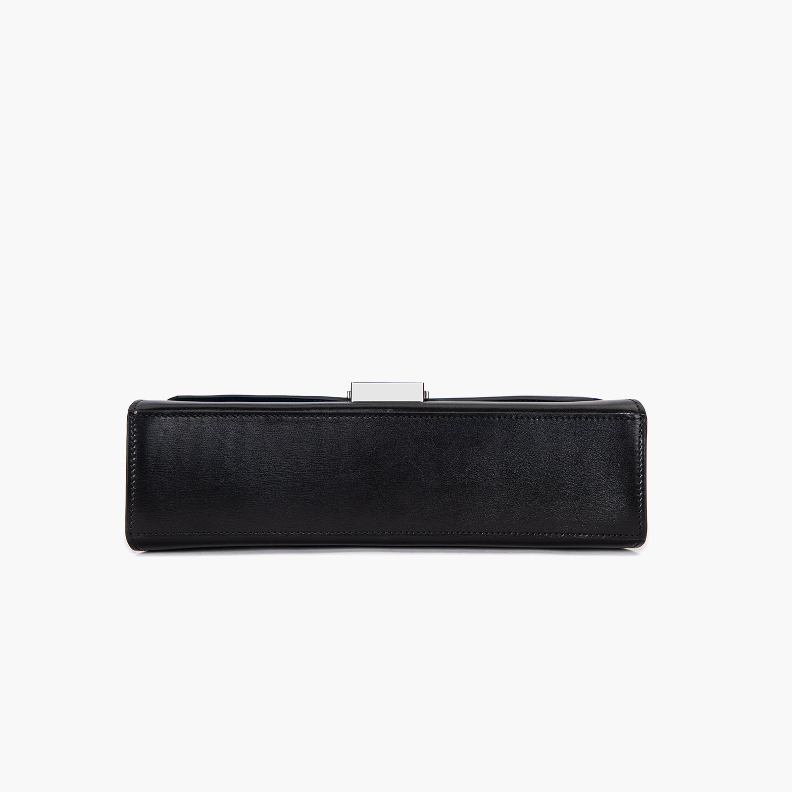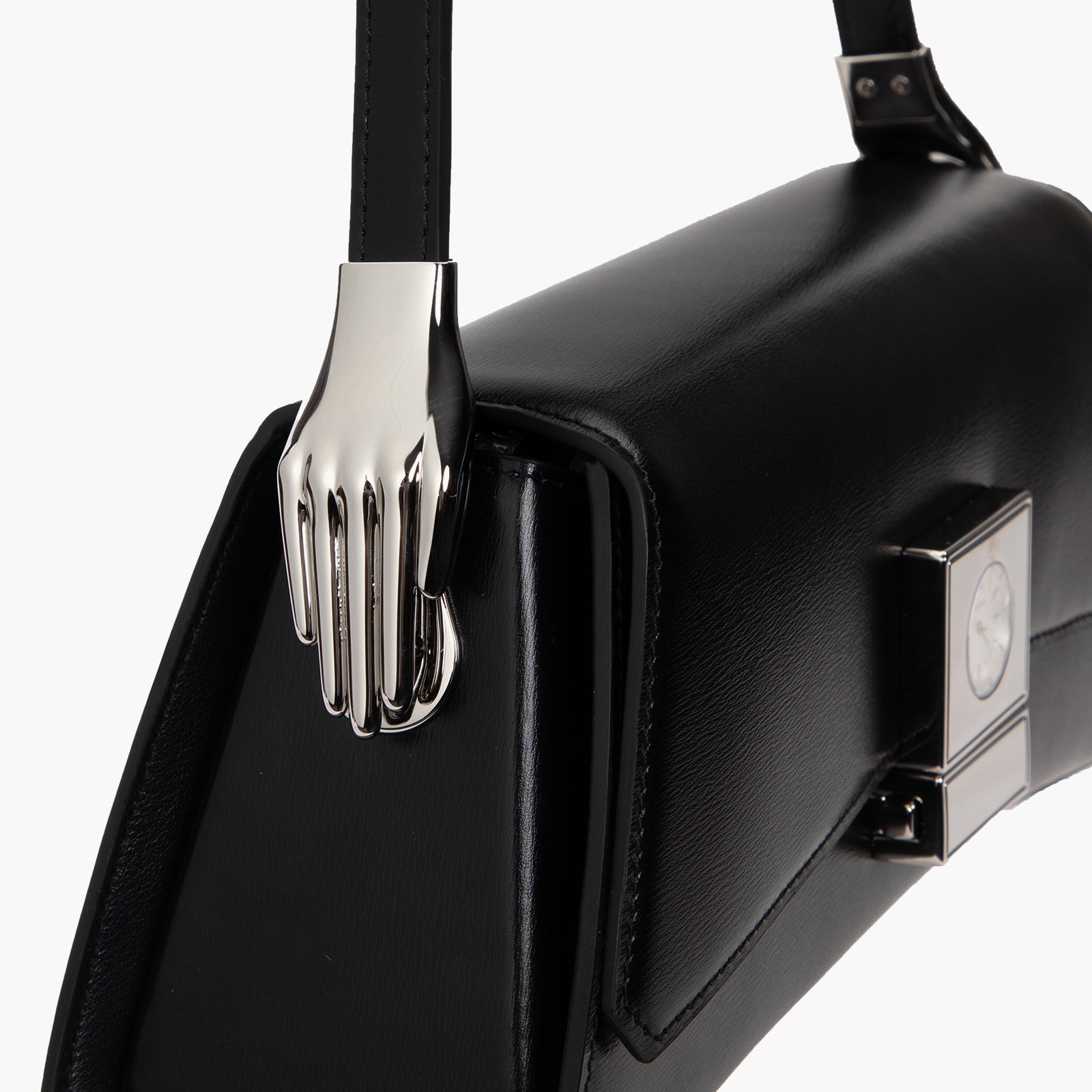 Custom silver from Noura-Noura Baguette Bag with an adjustable long shoulder strap, a flap closure, and a clock-shaped lock fastener.
